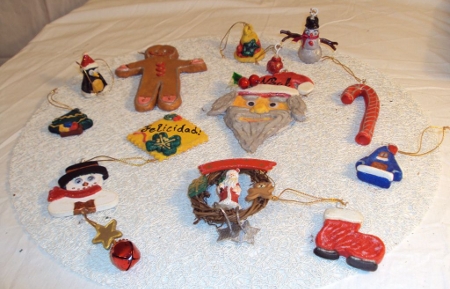 - harina- sal- agua- pintura acrílica- pinceles- moldes y herramientas de modelado- hembrillas- cordón dorado- purpurina (glitter glue)