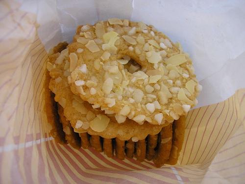 4.- Extender mantequilla sobre la placa del horno y colocar allí las rosquillas, previamente untadas con huevo batido y cubiertas con almendra picada y azúcar fina.