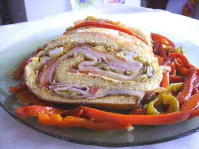 Armado:Desmoldar el arrollado y untarlo con parte de la preparación anterior. Colocarle el jamón y volver a untar con la mezcla de queso y mayonesa. Distribuir encima, primero la lechuga y luego los morrones, formando hileras.