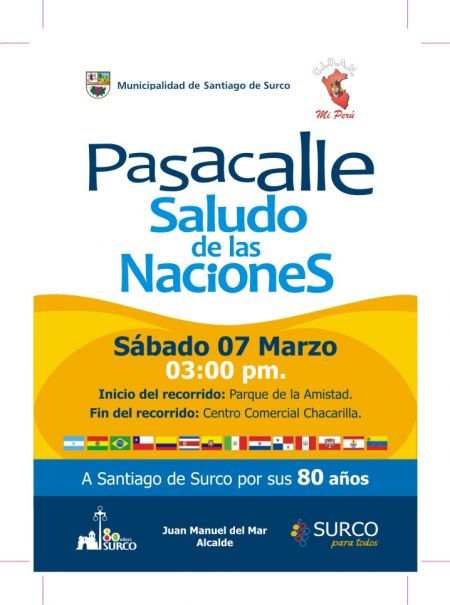 Culminando la presentación del espectáculo Encuentro Mundial de Folklore, mañana sábado 7 a las tres de la tarde, se desarrollará el Pasacalle "Saludo de las Naciones a Santiago de Surco por sus 80 años", teniendo como punto de partida el Parque de la Amistad (Calle Sacramento).