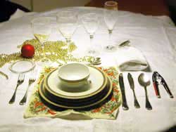 En primer lugar hemos de elegir la mantelería. Es muy importante porque la tendremos siempre presente. Lo más habitual es elegirla blanca, y a ser posible, que no sea de algodón. Una mantelería blanca realzará más los alimentos y dará sensación de limpieza. también es posible que esa mantelería tenga algún motivo navideño que nos recuerde las fechas en las que estamos. Las servilletas deberán ir a juego con el mantel, aunque si queremos algo más sencillo y cómodo, y menos protocolario, entonces podemos optar por unas buenas servilletas de papel adornadas con motivos navideños. Lo normal es colocarlas sobre el plato, dobladas o en triángulo, o si acaso, a la izquierda de los platos- Hay quien dice que se colocan a la derecha, pero el protocolo dice que a la derecha sólo se colocan cuando ya se han usado.