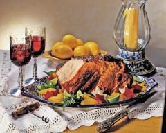 3) Sazonar con la canela y nuez moscada. Hornear a 200º C. por espacio de 50 minutos.4) Triturar las manzanas con el jugo del horneado y poner al fuego con la mantequilla. Dar un hervor para que la salsa quede ligada. Servir el asado con la salsa en salsera aparte.