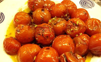 Espolvorearlos con el azúcar y la sal, y rociarlos con un poco de aceite. Cocinar en horno precalentado a temperatura suave por aproximadamente 1 hora. Retirar del horno, dar vuelta los tomates con cuidado de no romperlos, y cocinar por una hora más.