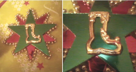 Tercero, cuando ya tengamos las estrellas pegadas ponemos en la estrella delantera el adorno dorado (bota) y luego pegar por todo el borde de la estrella final (estrella de 10 puntas) el collar de perlas plásticas doradas.Fuente: LasManualidades