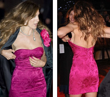 Aunque debía estar acostumbrada a lucir prendas de varios miles de dólares, Parker no estuvo precisamente muy cómoda según las imágenes publicadas por el diario Daily Mail.
