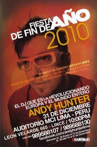 31.12.09 primera ves en Perú y para todo Latinoamérica, el Dj que a revolucionado europa y el mundo entero, creador de las bandas sonoras para Matrix, Día de la independencia, Narnia, Need for Speed, etc., "Andy Hunter", en la primera Fiesta Electronica nunca antes vista en Lima, una after party por Año Nuevo, dale la bienvenida al 2010 celebrando a Jesús. Te esperamos ...