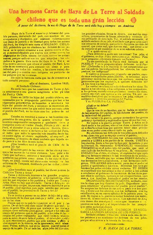 "Carta al Soldado Chileno" escrita por Víctor Raúl Haya de la Torre en 1925.