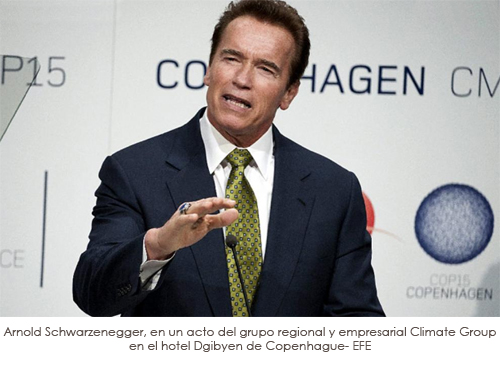 Arnold Schwarzenegger, gobernador de California, ex culturista de éxito y estrella de Hollywood, se ha presentado hoy en Copenhague como un "héroe de acción del clima". En una conferencia paralela a la negociación, Schwarzenegger llegó para defender el modelo de California de energías renovables y pedir a la ONU que dé más peso en la negociación a las regiones y estados: "California es sólo un Estado. Pero es la séptima economía del mundo y tenemos más capacidad de influencia que todo un continente", dijo.