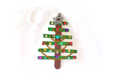 - 1 paleta de madera grande- 5 paletas de madera regular- pintura verde y marrón- 25 a 30 lentejuelas de colores- 1 guirnalda dorada fina- 1/2 guirnalda plateada fina- pincel- hilo- tijera- cola vinílica blanca