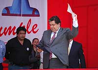Exigen que no lucren con el agua“Con el agua no se hace politiquería, señor presidente”, con estas palabras los representantes de los pobladores de la zona de Oquendo, Santa Rosa y ex fundo Naranjal expresaron ayer su indignación por las maniobras que buscan imponer a unos seudodirigentes ligados al jefe de Foncodes, Carlos Arana, con quienes éste apareció acompañando al presidente García durante la ceremonia de lanzamiento de convocatoria para la ejecución de obras del Sistema de Agua Potable y Alcantarillado en Oquendo, Santa Rosa y el Naranjal, en San Martín de Porres y el Callao.