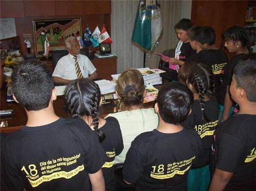 Fue durante la visita que efectuaron al titular huanuqueño un grupo de niños y adolescentes en la víspera de la celebración del Día de la No Impunidad en los Casos de Abuso Sexual, que se conmemora en Huánuco cada 18 de diciembre, tras ser institucionalizada a través de la Ordenanza Regional Nº 079 en el año 2006.