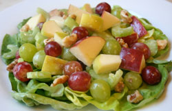 3 tazas de manzana (tipo delicia o chilena). 1 taza de apio. 1 1/2 taza de mayonesa. 1 1/2 cucharada de vinagre de manzana. Sal y pimienta. 2 tazas de uva verde despepada. 1 1/2 de pasas negras. 1 taza de pecanas picadas en trocitos.Preparación: