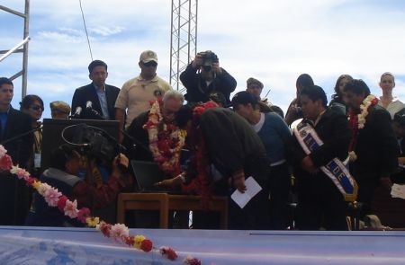 "Yo saludo a nuestro prefecto que me hace votar para que el lago Titicaca, lago sagrado del Titicaca sea una de las maravillas naturales del mundo vamos hacer la campaña y ya es un compromiso con todas la regiones de Bolivia y nuestro pueblo", indico el presidente Evo Morales en el discurso oficial.