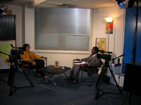 El periodista Elie Smith de 3Atelesud entrevistando a la Agregada Turística del Consulado General de Perú en París, María Elena Corvest, en la sede de la televisión africana en París