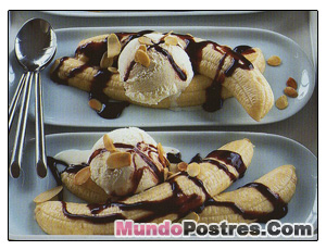 4 plátanos4 bolas de helado de vainilla4 cdas de salsa de chocolate2 cdas de almendras tostadas y laminadasProcedimiento