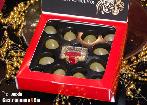 En Lo Mejor de la Gastronomía vimos estos estuches con uvas de Nochevieja, uvas de Vinalopó para espolvorear con escamas de oro de 22 quilates. El producto se promocionaba como una novedad que otorgaba lujo y glamour a las tradicionales Uvas de la suerte. La empresa responsable de la iniciativa es Uvasdoce y ofrece los estuches con doce uvas seleccionadas, de piel fina (característica de las uvas de Vinalopó), sin semillas y con una cajita con 20 gramos de escamas de oro que se espolvorearán sobre las uvas.