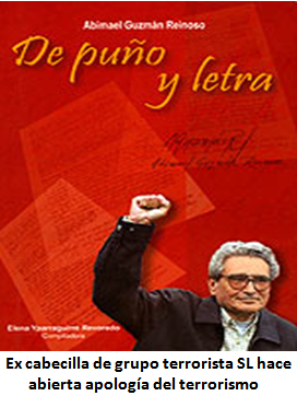 Por último, además de que la ex número dos de SL, Elena Iparraguirre, ha manifestado que su grupo pretende presentarse a las próximas elecciones, su principal cabecilla Abimael Guzmán –quien en la década de los 80 creó una maquinaria criminal para desquiciar al Estado–, el pasado 11 de diciembre presentó su libro “De puño y letra”, en el que hace una abierta apología del terrorismo y reafirma la condición totalitaria y extremista de ese grupo criminal.