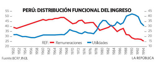 Este es un cuadro elaborado por el economista Humberto Campodónico, uno de los más lúcidos comentaristas de los procesos económicos en el Perú. Me gustaría resaltar algunos puntos: 1- La caída histórica de las remuneraciones en el Ingreso Nacional y el aumento de las utilidades empresariales. Para decirlo de otra manera, el crecimiento económico del Perú, desde 1978 (ajustes del FMI y política económica de Silva Ruete), se ha basado en un ajuste salarial, en un retraso sistemático del ingreso real. Situación que se ahonda con la hiperinflación Alanista de 1988. Los datos actuales apuntan que la baja participación de las remuneraciones en el Ingreso Nacional se mantiene vigente, a niveles de 1994. 2- Entre 1980-1992 las utilidades empresariales alcanzan picos históricos. Ello comienza (tendencia que viene desde 1978) con Silva Ruete y luego Manuel Ulloa.Y se dispara en el periodo 1988-90 (gestión de Cesar Vasquez Bazán). La hiperinflación hundió el salario de los trabajadores, pero no tocó las ganancias empresariales. Los empresarios nunca perdieron. La caída se da con el Fujichok del 90. A lo largo de la década se recuperaría con las diversas políticas neoliberales. Lo que no cambió fue el salario real. 3- El verdadero cambio es el de las remuneraciones y su recuperación, NO LAS OBRAS, NI EL PAVIMENTO NI EL CEMENTO O LAS TUBERÍAS. Para eso se eligió a Alan García en el 2006, para "Un cambio responsable" que dignificara al factor trabajo. No cumplió. 4- Los Alanistas que trabajan en el Gobierno, sueltan cifras sobre "obras" (Perú avanza), AGP dice que está redistribuyendo riqueza (mensaje de año nuevo), y Jorge insiste en lo del "Antisistema" para justificar el modelo anti salarial y antilaboral. Lo real, lo concreto, es que el salario no alcanza, el crecimiento no llega a los bolsillos de los trabajadores, y es falso que los empresarios hayan sido afectados en sus utilidades, en realidad, desde 1978 NO PIERDEN CASI NADA. La situación no es la misma con los pequeños y medianos empresarios, o el famoso autoempleo. Por hacer populismo con las reservas internacionales en su primer gobierno AGP desencadenó una pavorosa crisis que golpeó a los más pobres. Y ahora por hacer populismo de derecha y reconciliarse con los grandes empresarios, mantiene casi congelado el ingreso real de los trabajadores. ¿Cuando tendrá el Perú un Gobierno Aprista, de Frente Único, de Estado Antimperialista, de Gobierno de los productores de Democracia Funcional, o al menos un Gobierno Aprista-Socialdemocrata de izquierda? Saludos, Eduardo Bueno